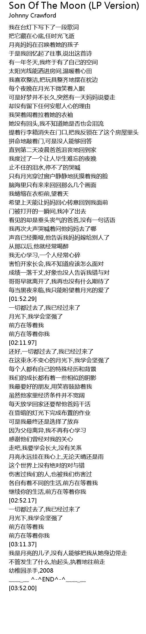 | [03:32.79] | 我是月亮的儿子,没有人能够把我从她身边带走 |