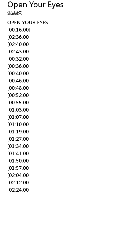 | [04:47.00][02:36.00][00:18.00] | Open your eyes |