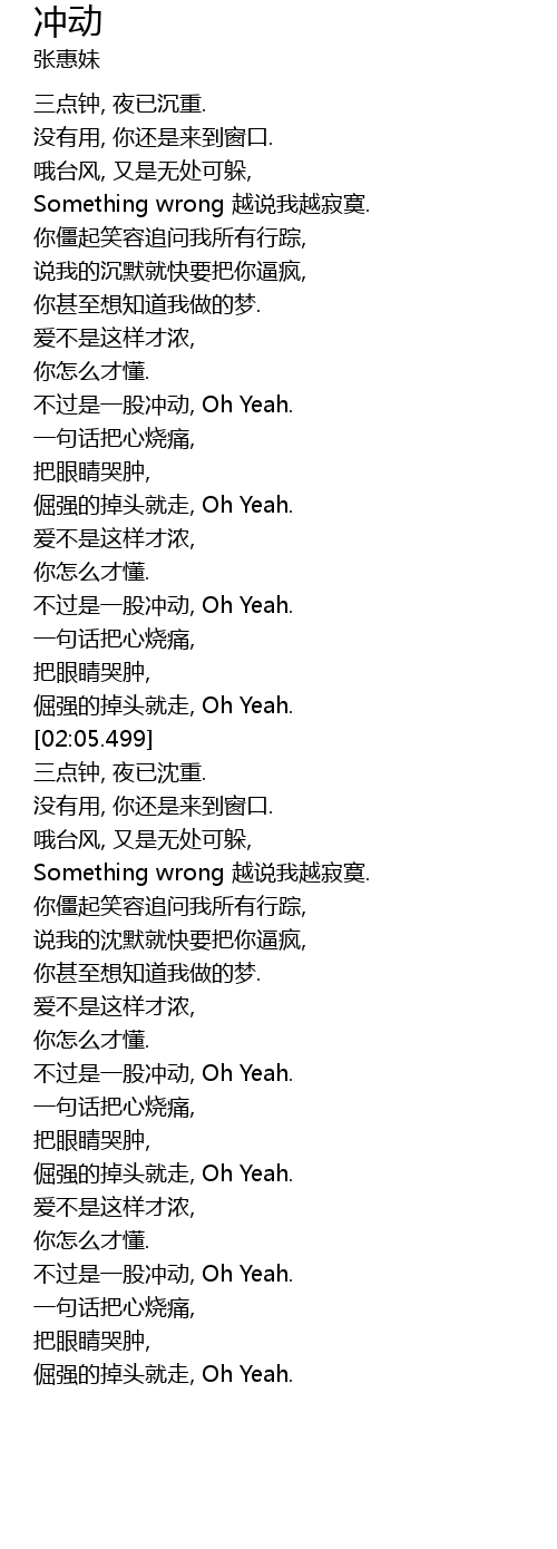 | [01:46.499] | bù guò shì yī gǔ chōng dòng, Oh Yeah. |