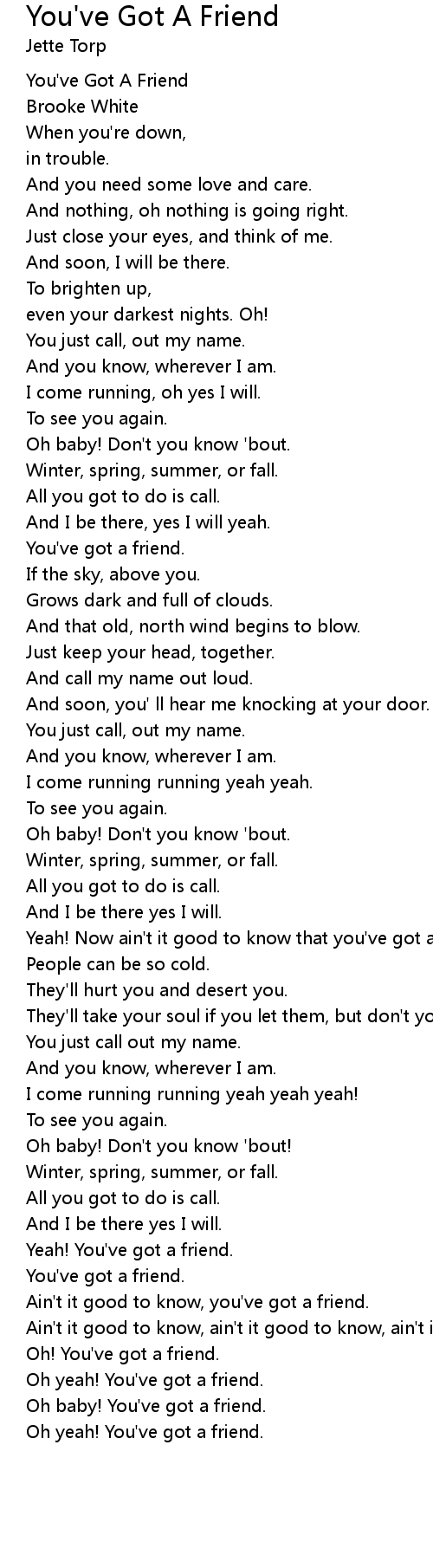 Yeah! Now ain't it good to know that you've got a friend. |