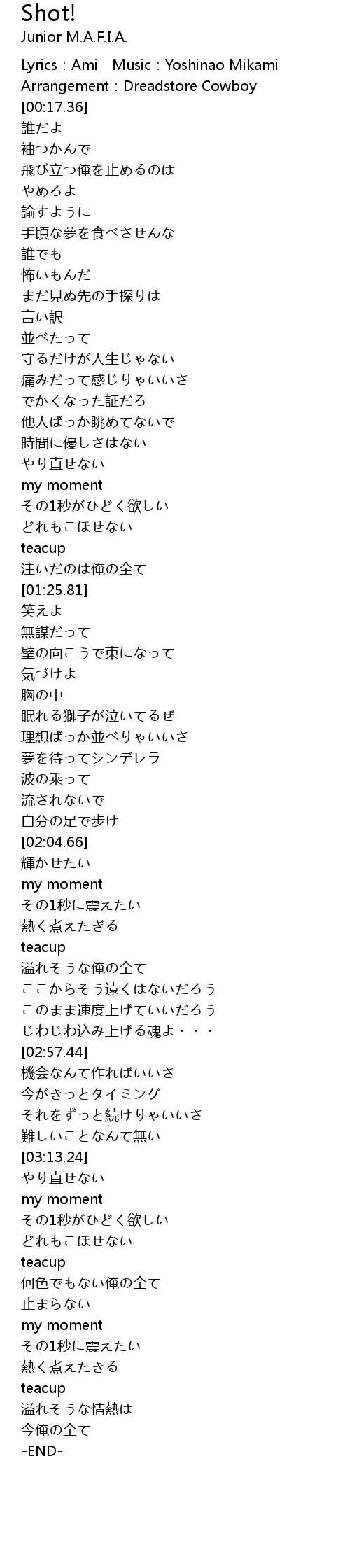 | [00:04.79] | Lyrics: Ami Music: Yoshinao Mikami |