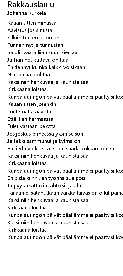 | Kunpa auringon p iv t p ll mme ei p ttyisi koskaan | |
