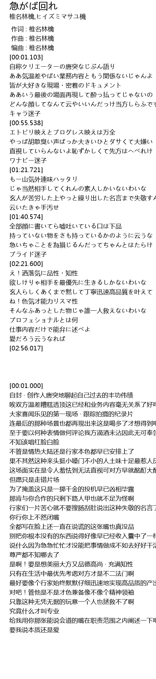 | [02:09.322] | 急いちゃことを為損じるんだってちゃんとはたらけ |