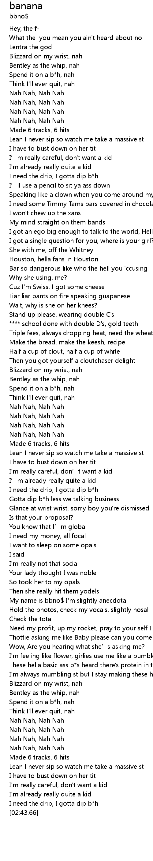 | [02:41.73] | I need the drip, I gotta dip b*h |