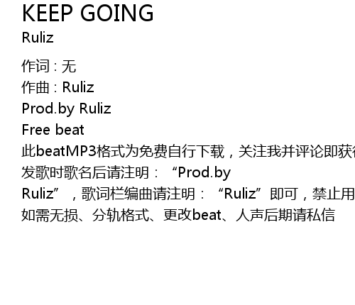 | 发歌时歌名后请注明:“Prod.by Ruliz”,歌词栏编曲请注明:“Ruliz”即可,禁止用于商业性质,尊重知识产权,侵权必究,谢谢。 | |