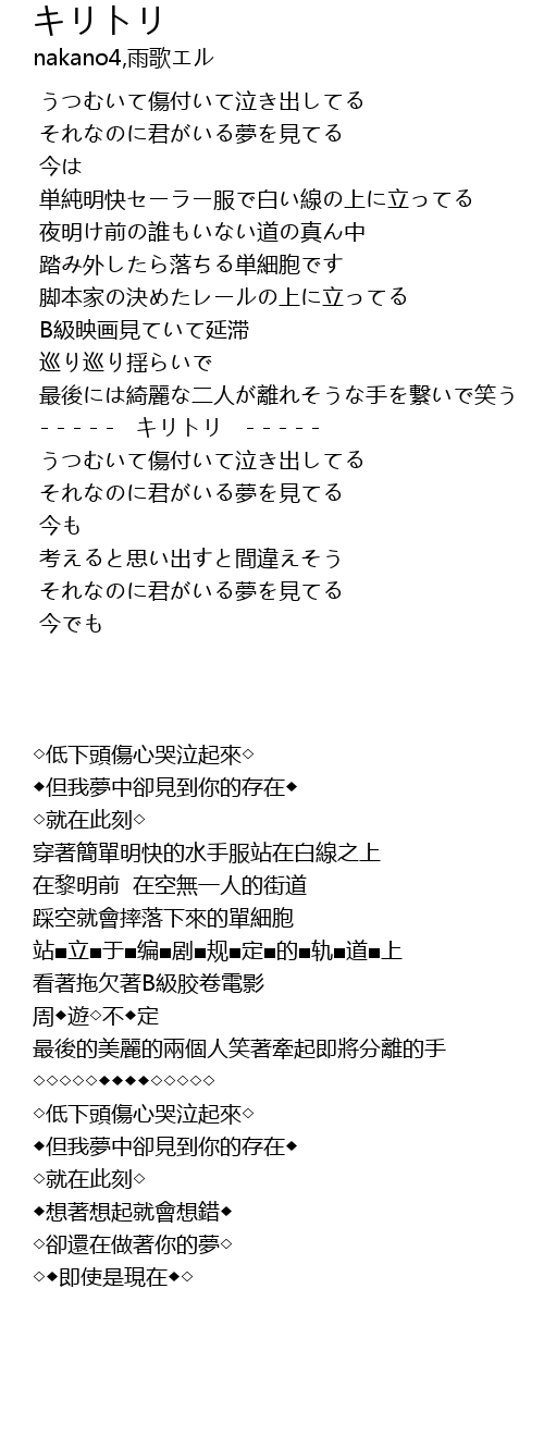 | [00:02.317] | うつむいて傷付いて泣き出してる |