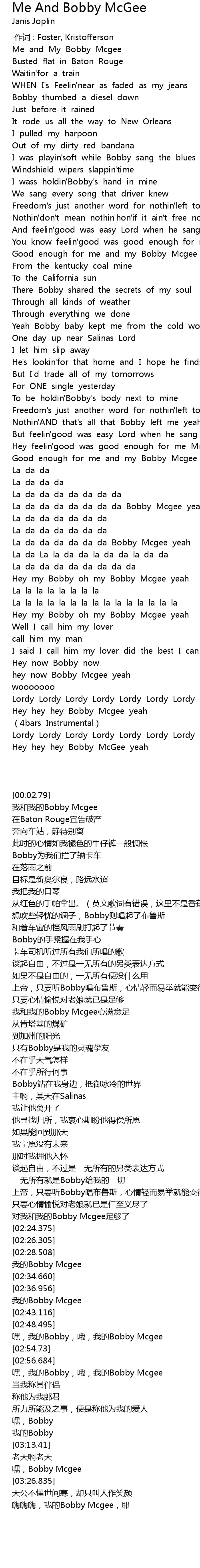 | [03:00.862] | Hey my Bobby oh my Bobby Mcgee yeah |