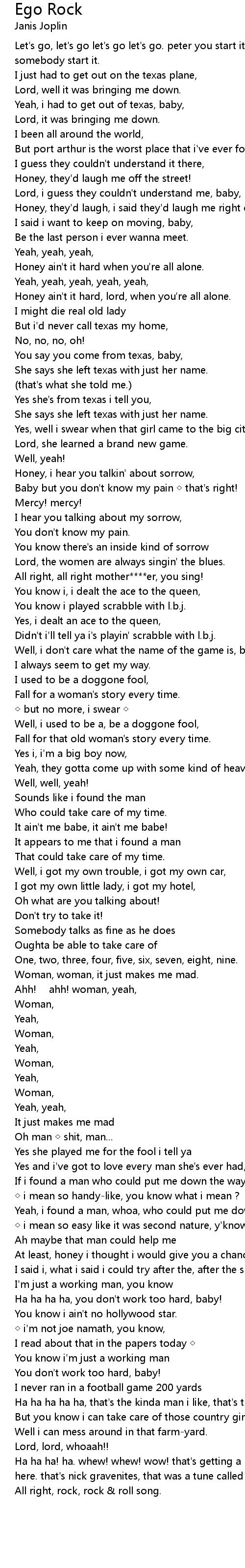 | Ha ha ha! ha. whew! whew! wow! that' s getting a little too close, too heavy here. that' s nick gravenites, that was a tune called ego rock. no! ... | |