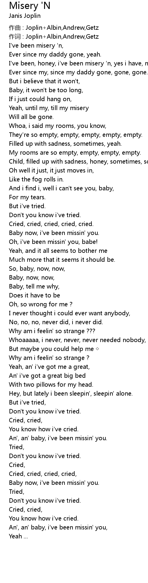 | I' ve been, honey, i' ve been misery ' n, yes i have, now. | |