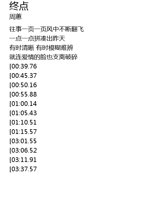 | [03:42.40][03:37.57][03:17.06][01:36.12] | 你我之间走到了终点 |