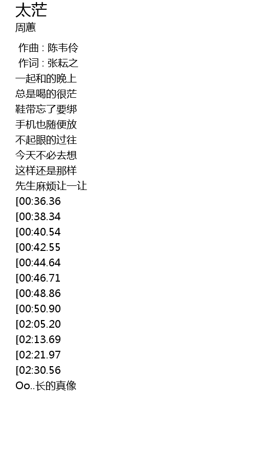 | [02:55.70][02:21.97][01:13.88] | 太茫 太茫 真的想躺一躺 |