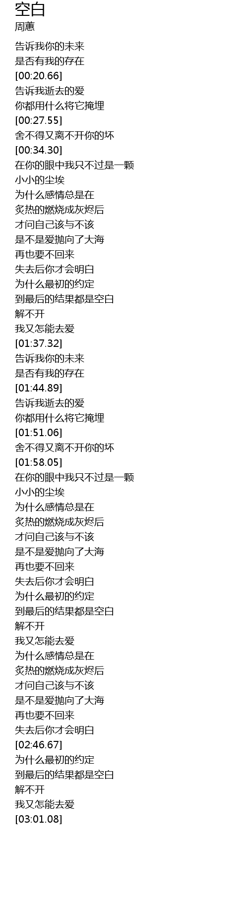 | [02:21.54] | dào zuì hòu de jié guǒ dōu shì kòng bái |