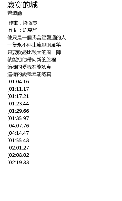 | [04:20.83][04:07.76][03:20.30][01:43.12] | 我的心是一座寂寞的城 |