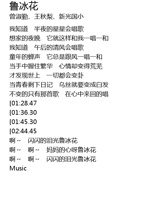 | [02:53.26][02:44.45][01:53.57] | yè yè xiǎng qǐ mā mā de huà shǎn shǎn de lèi guāng lǔ bīng huā |
