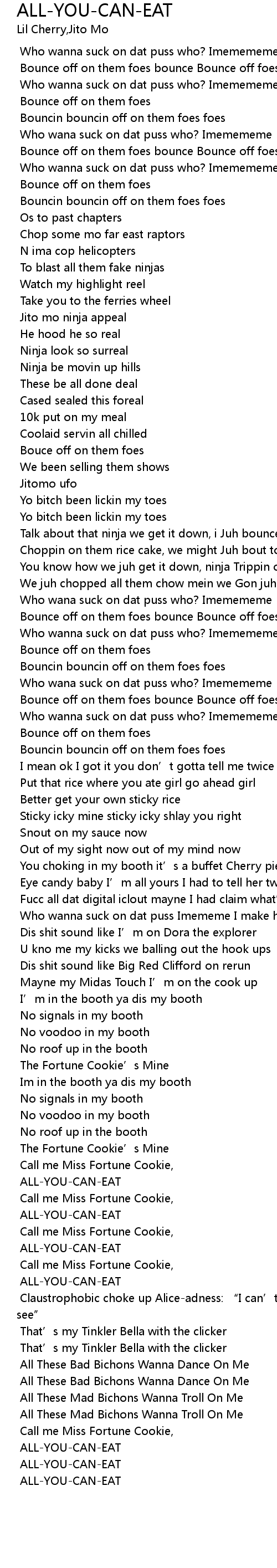 | [03:05.350] | ALLYOUCANEAT |