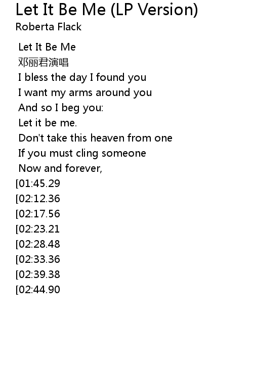 | [01:02.17][01:45.29][02:50.55][03:01.03][03:12.19] | let it be me. |
