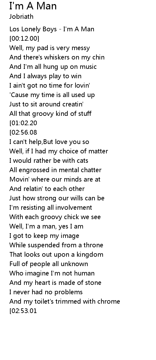 | [03:00.65][02:53.01][02:45.97][02:38.70] | I'm a man, yes I am |