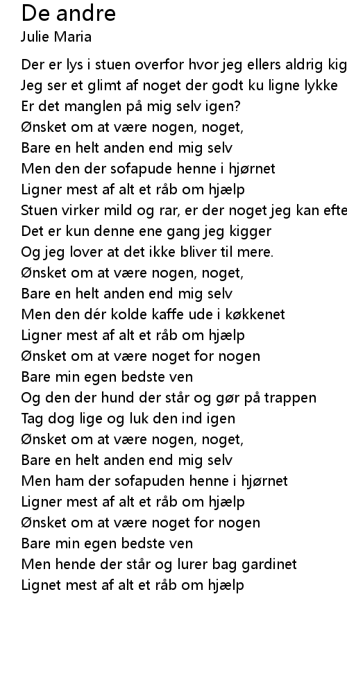 | Der er lys i stuen overfor hvor jeg ellers aldrig kigger ind | |