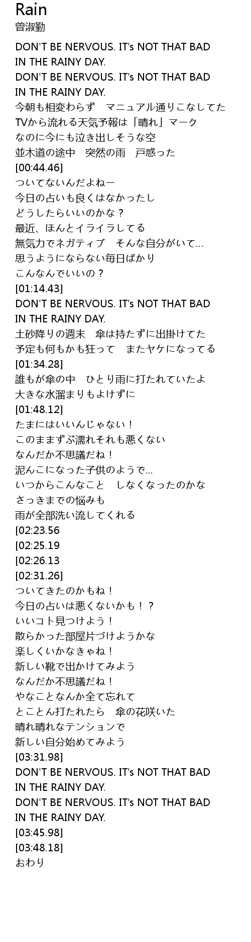 | [02:27.06][02:23.56][02:20.09][02:17.04] | IT' S RAINY DAY. NOT THAT BAD. |