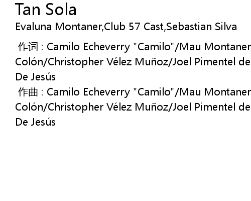 | [00:00.000] | zuò cí : Camilo Echeverry " Camilo" Mau Montaner Erick Brian Coló n Christopher Vé lez Mu oz Joel Pimentel de Leó n Richard Camacho Zabdiel De Jesú s |