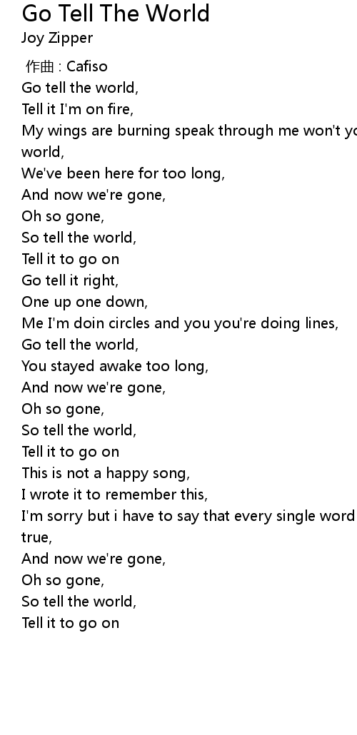 | [00:12.06] | Go tell the world, |