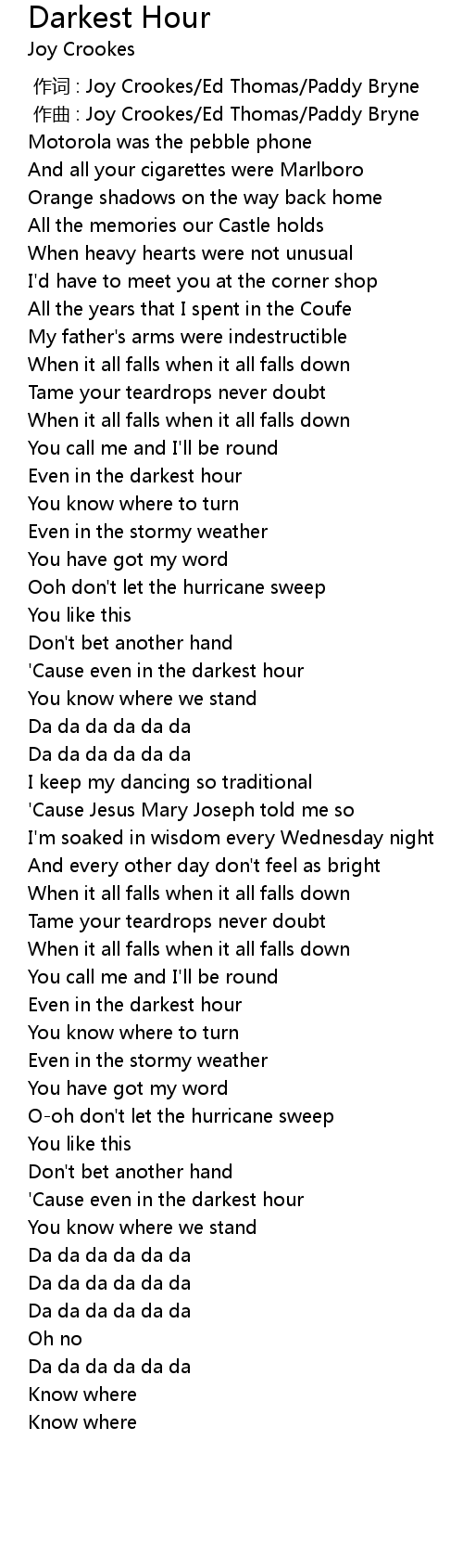 | [00:00.000] | zuo ci : Joy Crookes Ed Thomas Paddy Bryne |