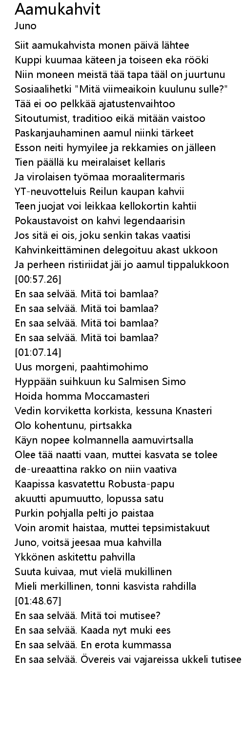 | [01:38.68] | Juno, voitsä jeesaa mua kahvilla |