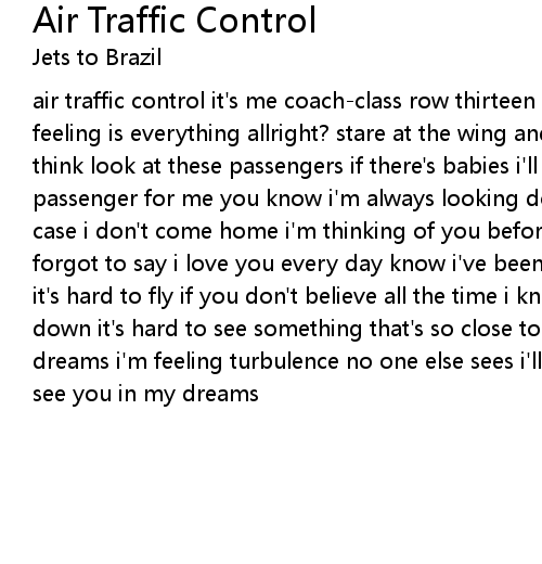 air traffic control it's me coach-class row thirteen i've got that sinking feeling is everything allright? stare at the wing and think it's later than i think look at these passengers if there's babies i'll survive it's hard to be a passenger for me you know i'm always looking down i will compose this note in case i don't come home i'm thinking of you before the plane goes down if i forgot to say i love you every day know i've been keeping track in my quiet way it's hard to fly if you don't believe all the time i know i sometimes let you down it's hard to see something that's so close to me but i'll see you in my dreams i'm feeling turbulence no one else sees i'll see you in my dreams i'll see you in my dreams |