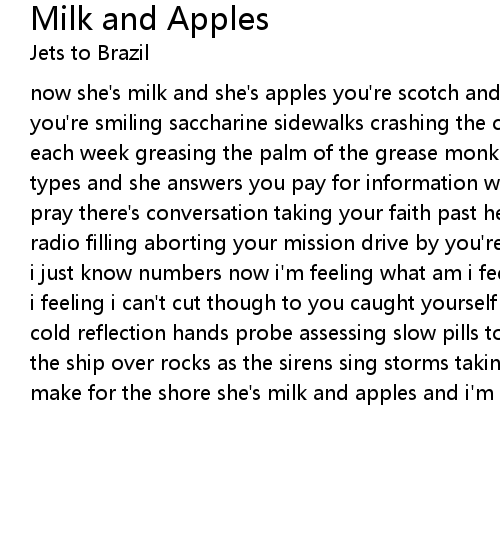 now she's milk and she's apples you're scotch and segregation lips like molasses you're smiling saccharine sidewalks crashing the car just to make a connection each week greasing the palm of the grease monkey keep it discreet while she types and she answers you pay for information wonder what are the chances just pray there's conversation taking your faith past her desk on a mid day drive radio filling aborting your mission drive by you're in the bathroom playing dead i just know numbers now i'm feeling what am i feeling what am i feeling and what i feeling i can't cut though to you caught yourself while undressing nude in a cold reflection hands probe assessing slow pills to change the painting running the ship over rocks as the sirens sing storms taking the water to heart as you make for the shore she's milk and apples and i'm on nine |