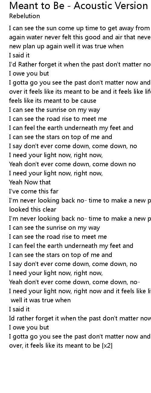 I need your light now, right now and it feels like life is taking over, it feels like its meant to be [x2] well it was true when |