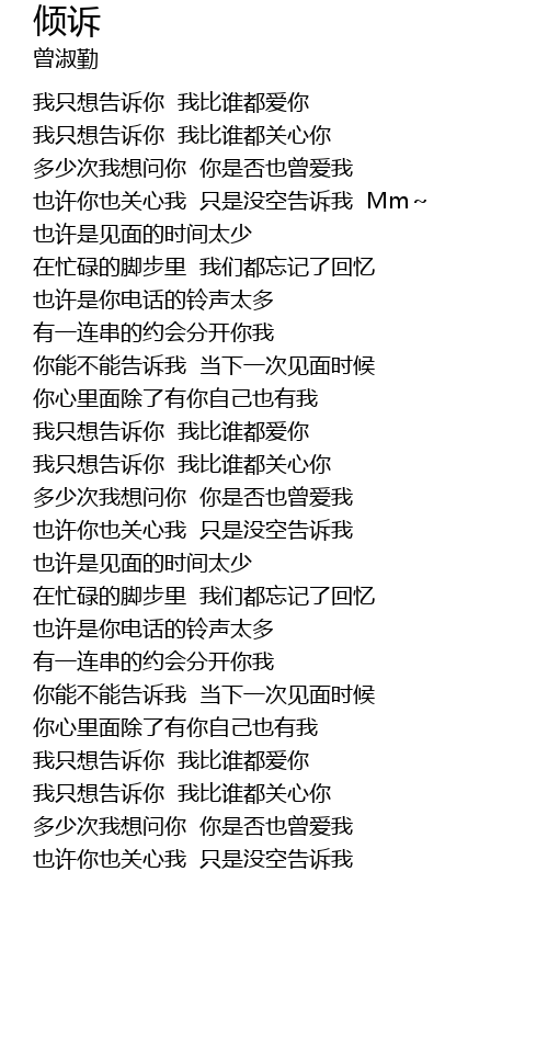 | [00:15.489] | wǒ zhǐ xiǎng gào sù nǐ wǒ bǐ shuí dōu ài nǐ |