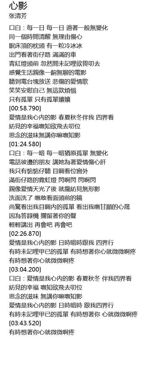 | [02:33.900] | 愛情是我心內的影 日時暗時跟我 四界行 |