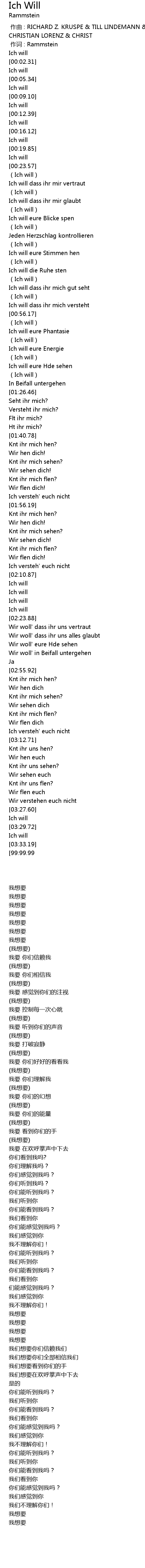 | [00:00.00] | 作曲 : RICHARD Z. KRUSPE & TILL LINDEMANN & PAUL LANDERS & DOKTOR CHRISTIAN LORENZ & CHRIST |