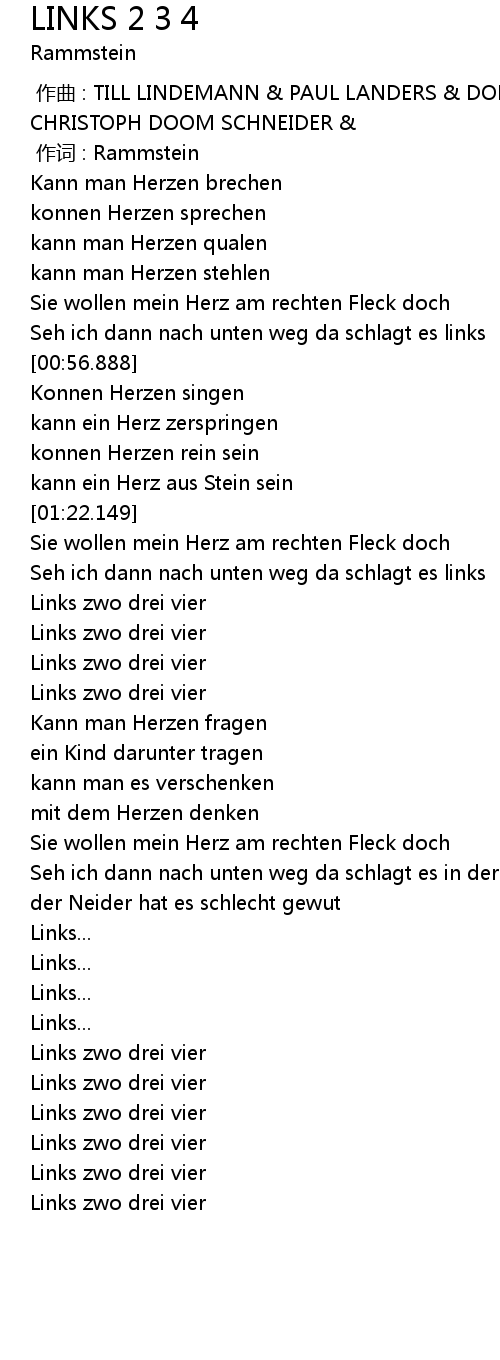 | [00:00.00] | zuo qu : TILL LINDEMANN PAUL LANDERS DOKTOR CHRISTIAN LORENZ CHRISTOPH DOOM SCHNEIDER |