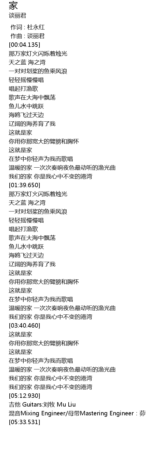 | [04:42.584] | 温暖的家 一次次奏响夜色最动听的渔光曲 |