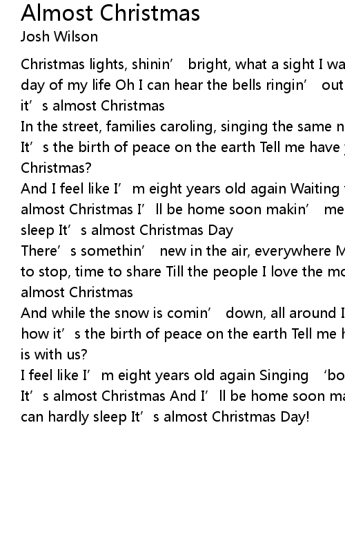 | And I feel like I’m eight years old again Waiting for December 25th It’s almost Christmas I’ll be home soon makin’ memories So excited I can hardly sleep It’s almost Christmas Day | |