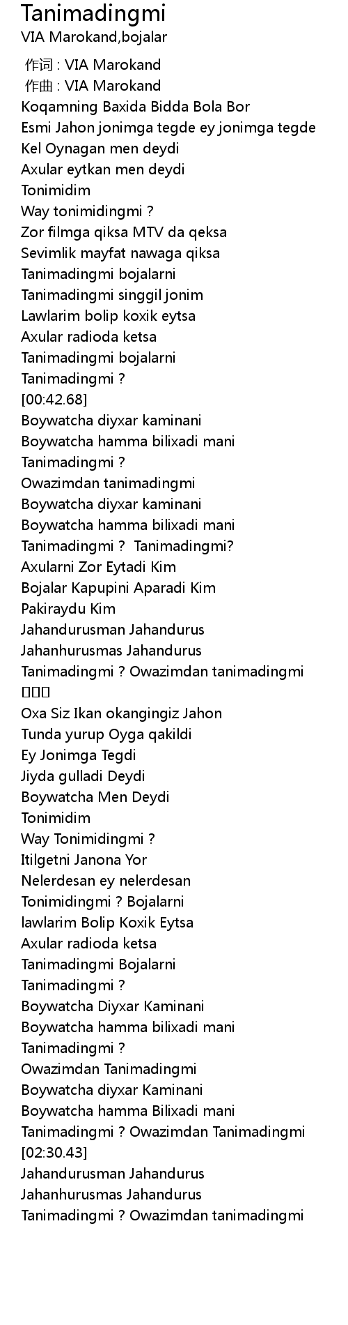 | [02:44.49] | Tanimadingmi ? Owazimdan tanimadingmi |