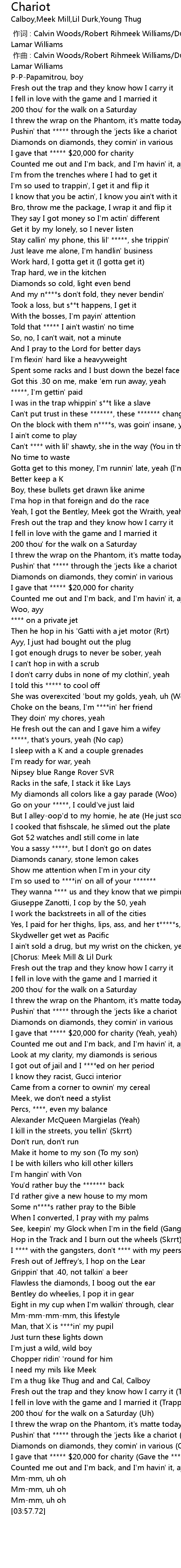| [03:37.10] | Pushin' that ***** through the 'jects like a chariot (Yeah) |