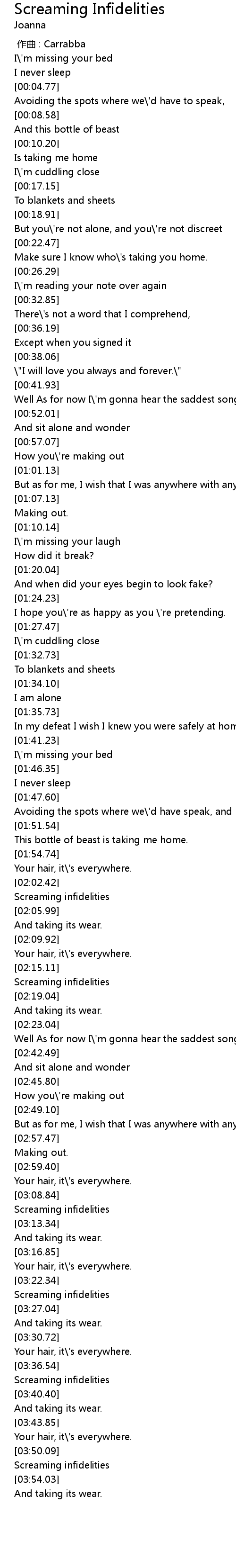 | [00:19.78] | But you\'re not alone, and you\'re not discreet |