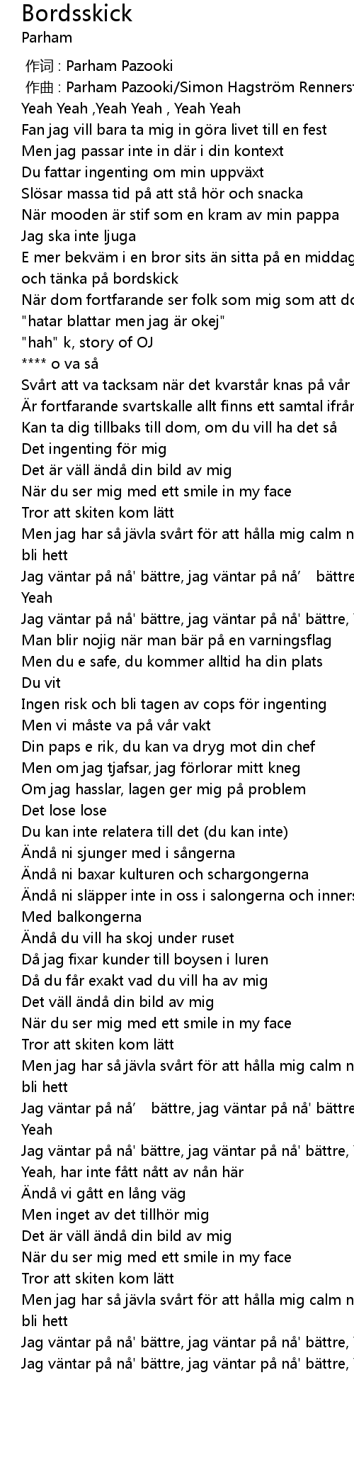 | [02:47.22] | Jag väntar på nå' bättre, jag väntar på nå' bättre, Yeah Yeah |