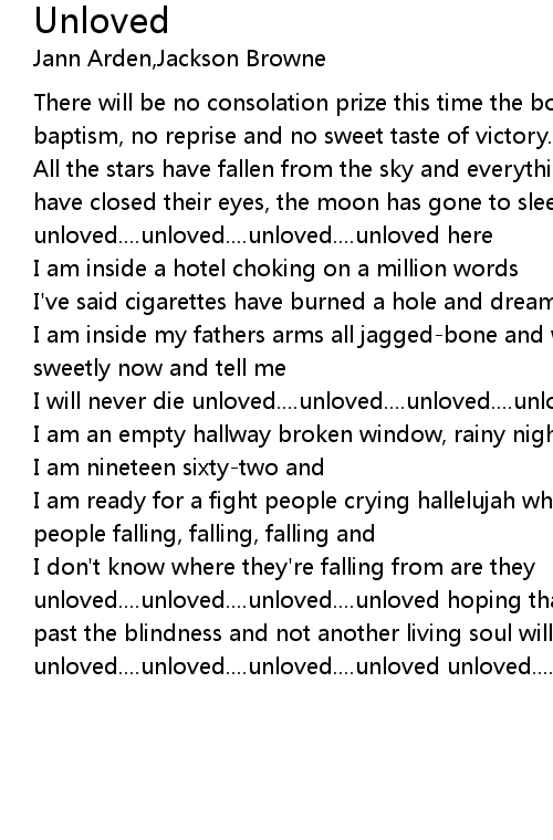 I don't know where they're falling from are they unloved....unloved....unloved....unloved hoping that the kindness will lead us past the blindness and not another living soul will ever have to feel unloved....unloved....unloved....unloved unloved....unloved |