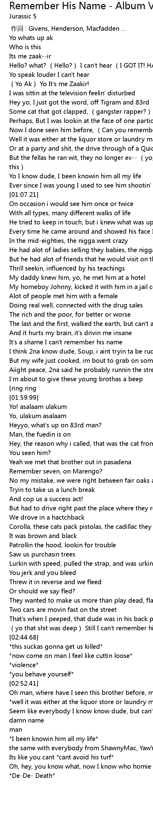 | [02:42.53] | (yo that shit was deep) Still I can't remember his name.. |