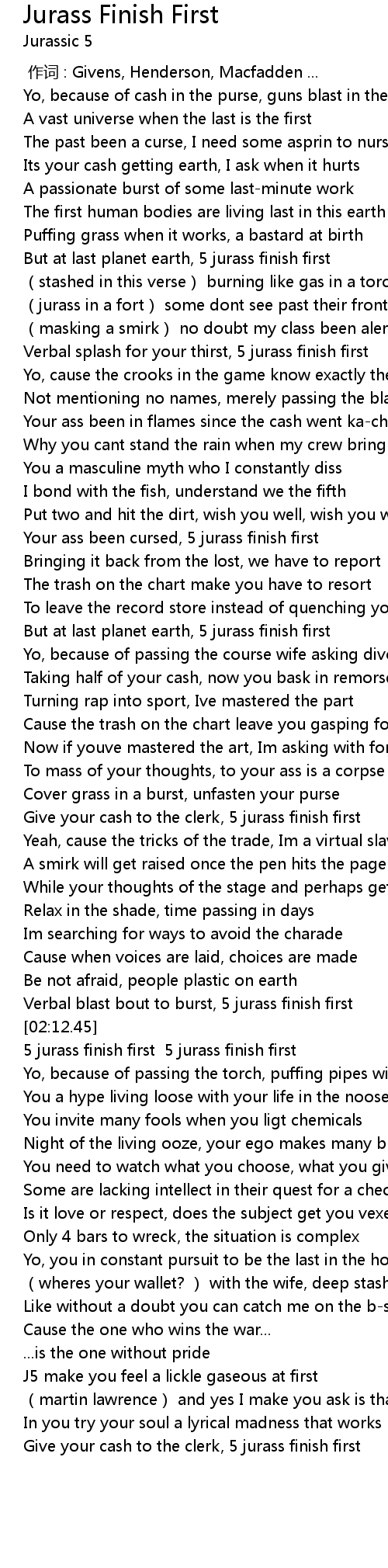 | [00:44.70] | Verbal splash for your thirst, 5 jurass finish first |