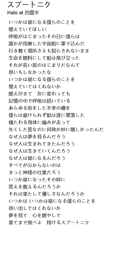 | [02:57.346] | 果てまで飛べよ 翔けるスプートニク |