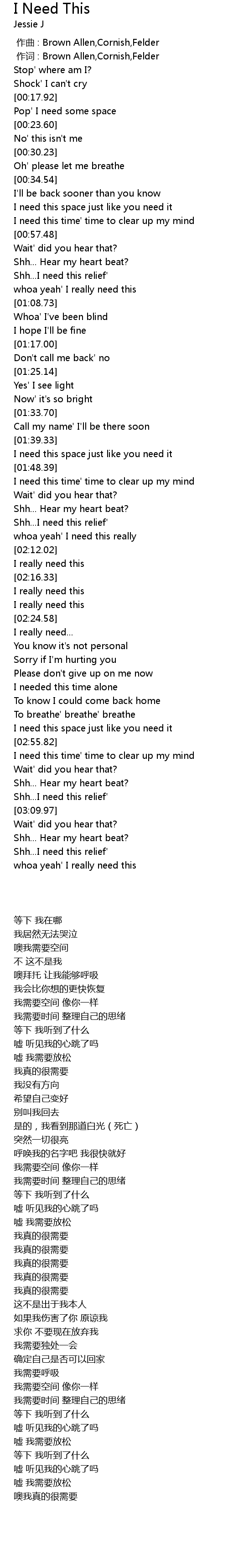 | [02:56.57] | I need this time' time to clear up my mind |