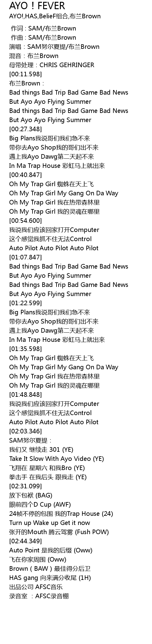 | [00:31.096] | dài nǐ qù Ayo Shop wǒ de gē men chū bù lái |