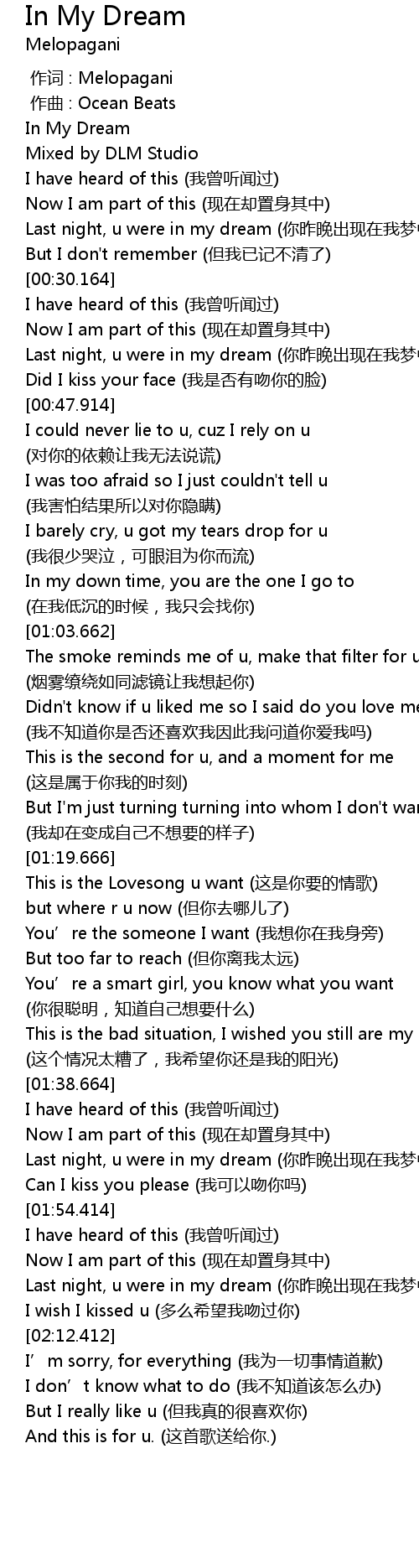 | [02:03.414] | Last night, u were in my dream ni zuo wan chu xian zai wo meng zhong |