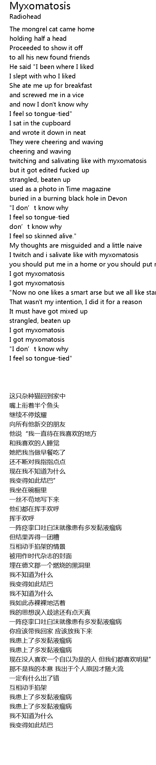 | [02:29.68] | I twitch and i salivate like with myxomatosis |