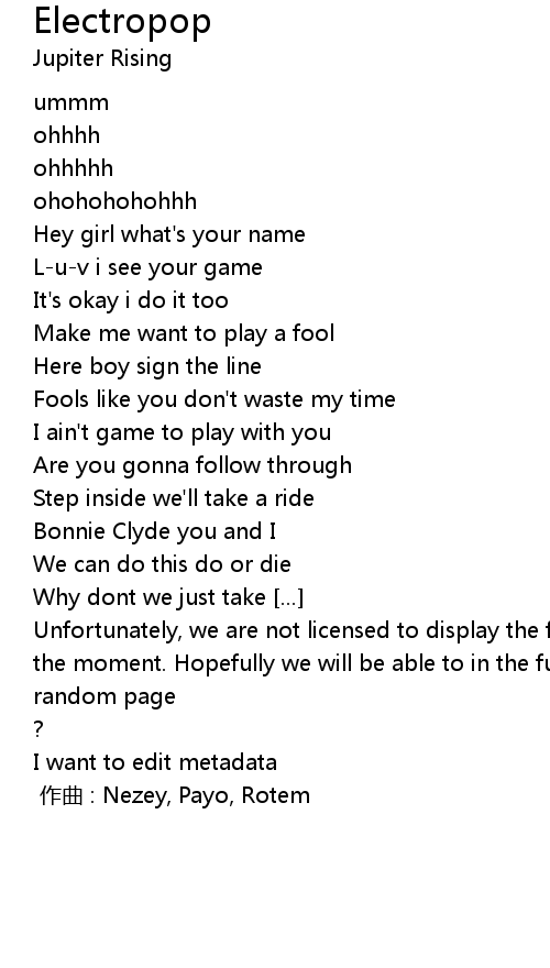 | Unfortunately, we are not licensed to display the full lyrics for this song at the moment. Hopefully we will be able to in the future. Until then, how about a | |