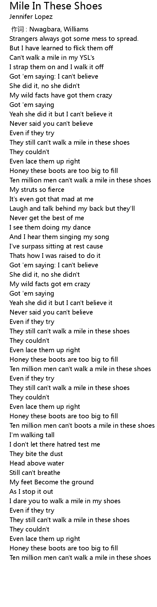 | [03:03.03] | Ten million men can' t walk a mile in these shoes |